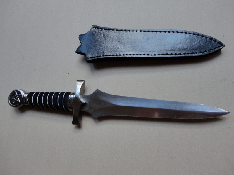 Athame with Black Handle and Pentagram. Stainless Steel Blade. Leather Sheath. 35cm.
