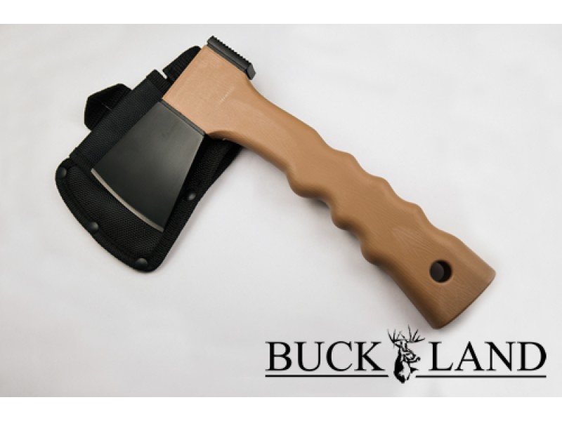 This axe features a black oxide finish 420 stainless steel axe head with a hammer on the reverse. The nylon glass fiber handle measuring 8.86 inches is virtually unbreakable. It is hollow so that for extra leverage salvaged wood can be inserted to make a monster axe. It comes with a nylon sheath. Ideal for general use, chopping logs and sticks for fire or small trees.