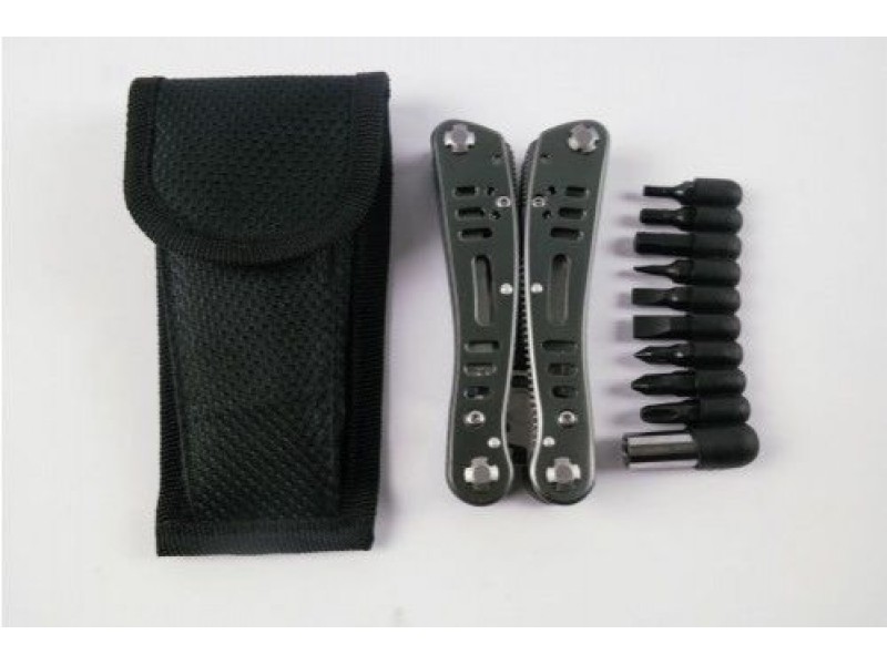 This multi tool features stainless steel locking folding tools including a knife, file, screw drivers, pliers, bottle opener and other tools, held together with a steel handle overall measuring 6.6 inches.