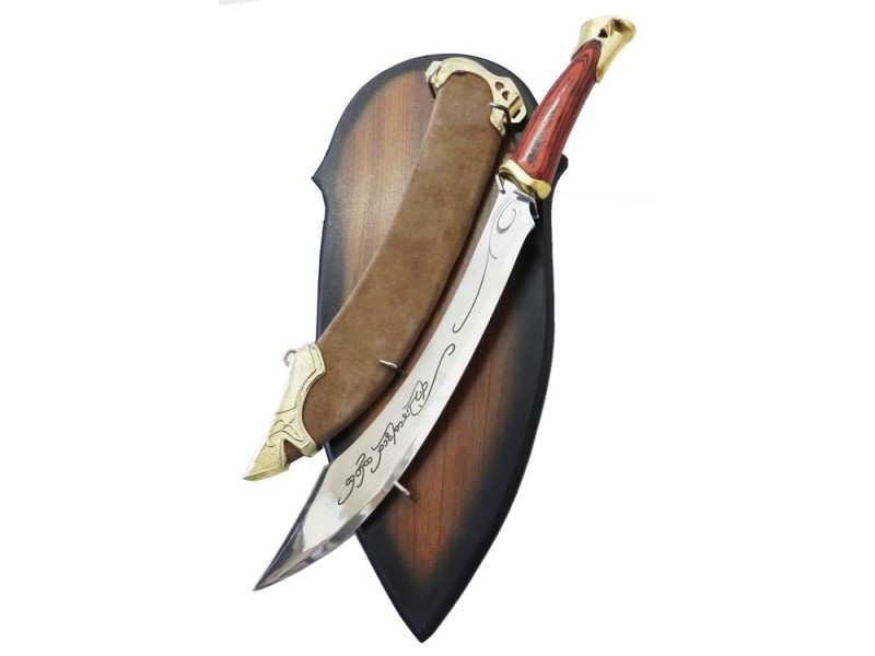 This is the Elven sword of the Ranger, or sometimes called the elven knife of the Ranger. It is made of 440 stainless steel blade and wooden handle. At 20" this is a full size reproduction. It comes with a sheath and a wall plaque. it also comes in a nice box. It is the best replica on the market.
