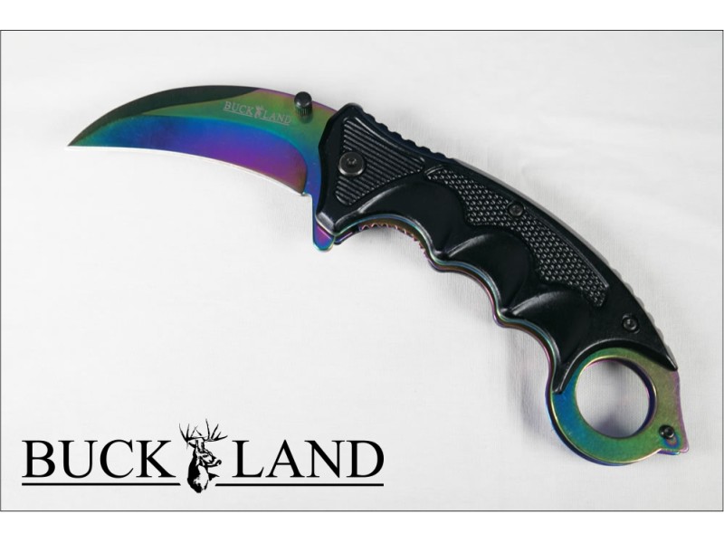 "The Rainbow Claw" effect is given by the titanium coating the knife and handle are covered in. The blade is 420 stainless steel and the knife is a locking folding knife. This is a beautiful little knife.