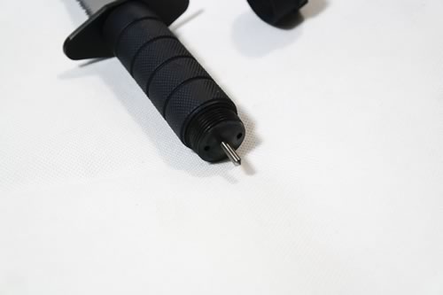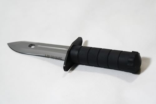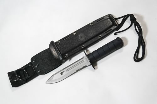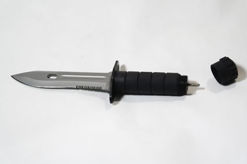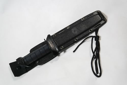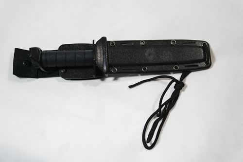 The knife beign held in the sheath by a rubber ring and the knife by itself.