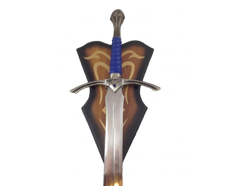 The handle is covered in a medium blue leather and the pommel of the handle is also made of metal which is molded into a ball like shape. The sword also arrives with its own wall mount.