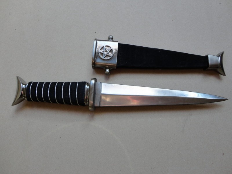 Athame with Black Handle Moon Shaped Pommel with Pentagram on Sheath.