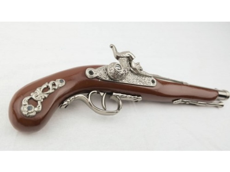 This is a replica of a Scottish Jacobite Flintlock Pistol. It is full size. It is made of a solid wood stock with metal fittings. It is a high quality reproduction.