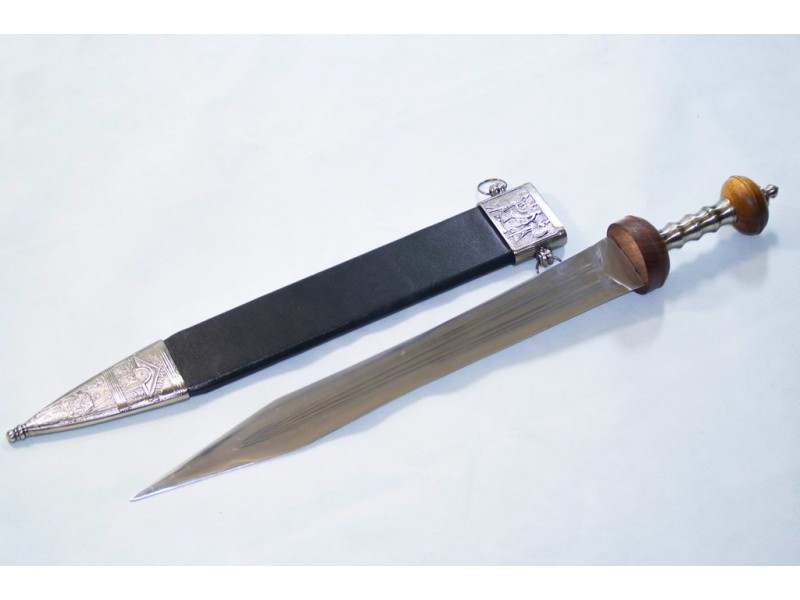 The handle is made of a stainless steel grip with wooden pommel and guide, finished with a metal point at the end of the pommel (bottom pf the handle). The sheath entrance has a metal edge with an image of a group of roman's. At the side are 2 rings to be attacked to string or a belt.