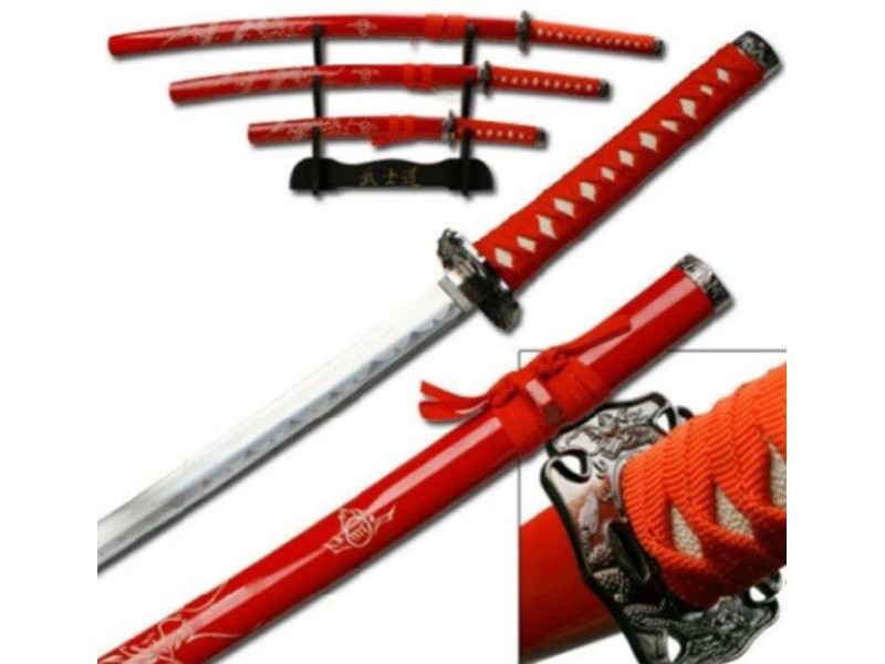Red Set of 3 with samurai swords with engraved Dragon (Carbon Steel Blade)