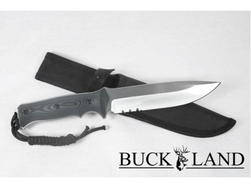 This is an exceptionally high quality knife. The blade is 3CR stainless steel. The handle is G10. It comes with a stiff nylon sheath. This is a knife that will never let you down.