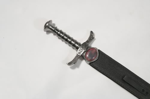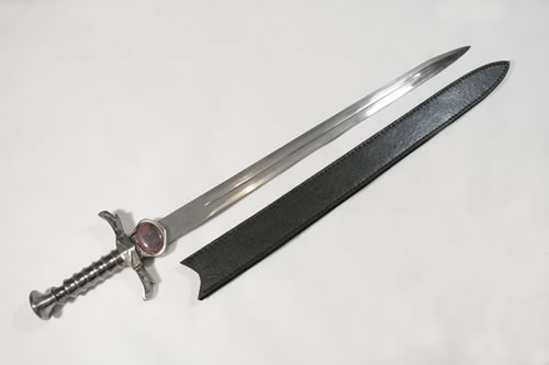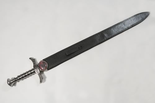 Sword of Thunder Small. It 26" (66cm) long. It is made of stainless steel. It weighs around 2kg. It comes with a leather scabbard.