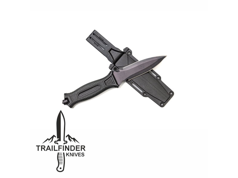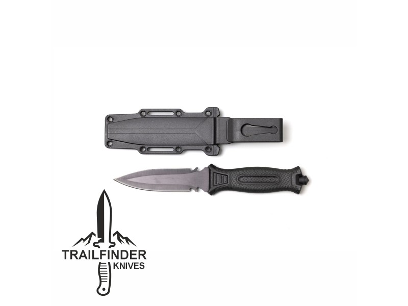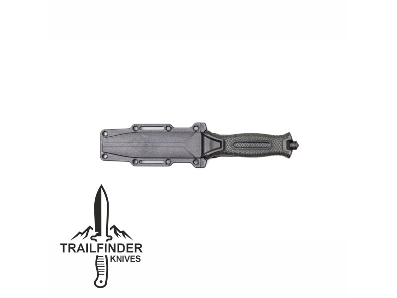 Fixed blade knife, total length 25cm, black blade, black plastic handle with glass breaker, including black sheath in plain white box packaging
