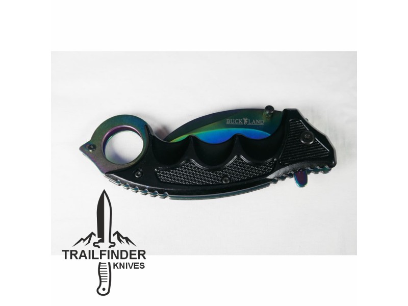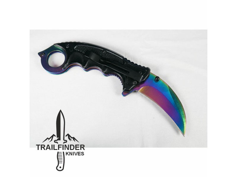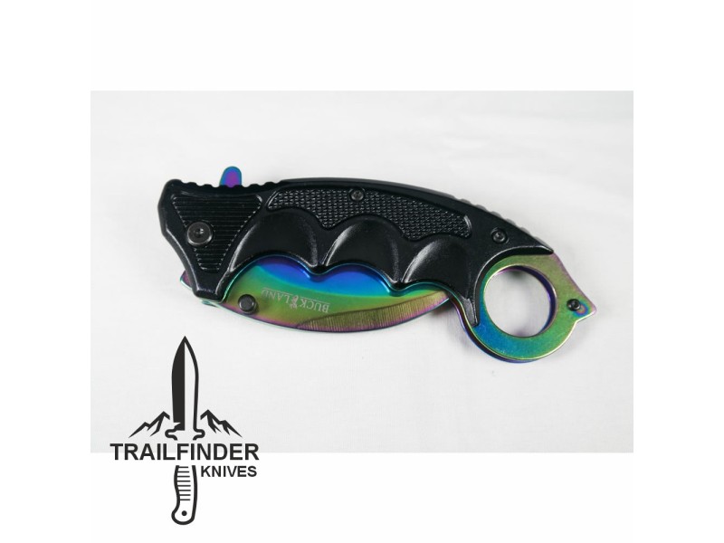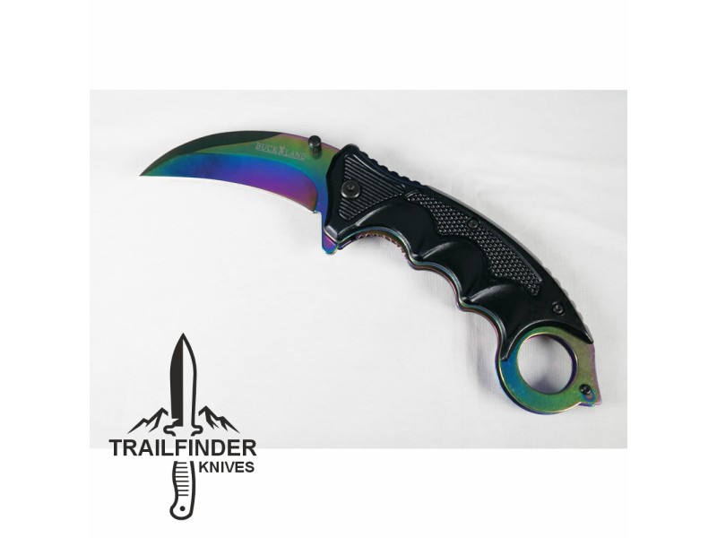 "The Rainbow Claw" effect is given by the titanium coating the knife and handle are covered in. The blade is 420 stainless steel and the knife is a locking folding knife. This is a beautiful little knife.