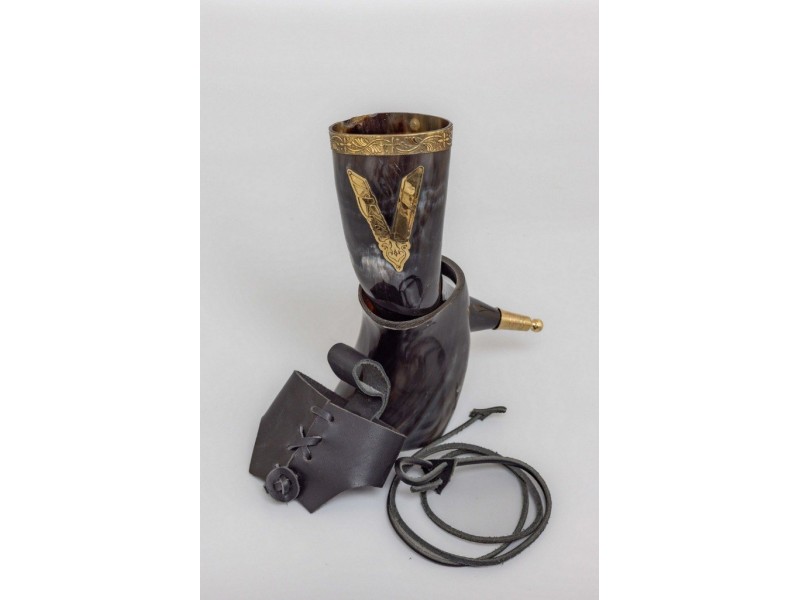 V for Viking Drinking Horn with Belt Frog, Leather Shoulder Strap, and Genuine Horn Table Stand.