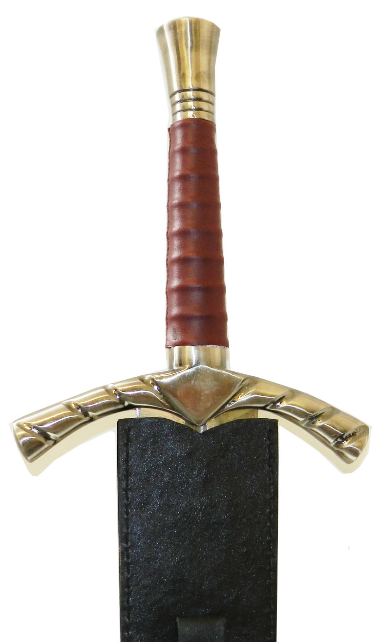 The Steward'd Sword weighs in at 2000g without the sheath and 2160g with the sheath. With the 440 stainless steel blade and the leather handle, the sword has a length of 40 inches, it also come with a black leather sheath.